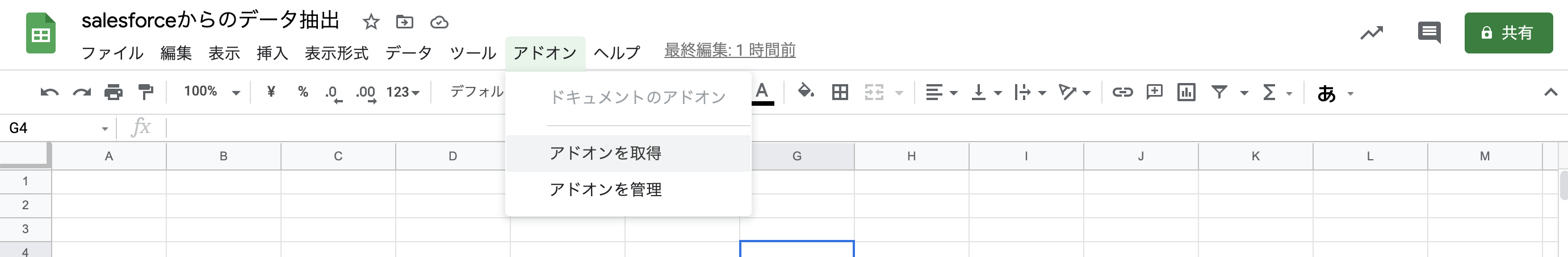 まずスプレッドシートを開いて、”アドオン” > ”アドオンを取得”をクリックします。