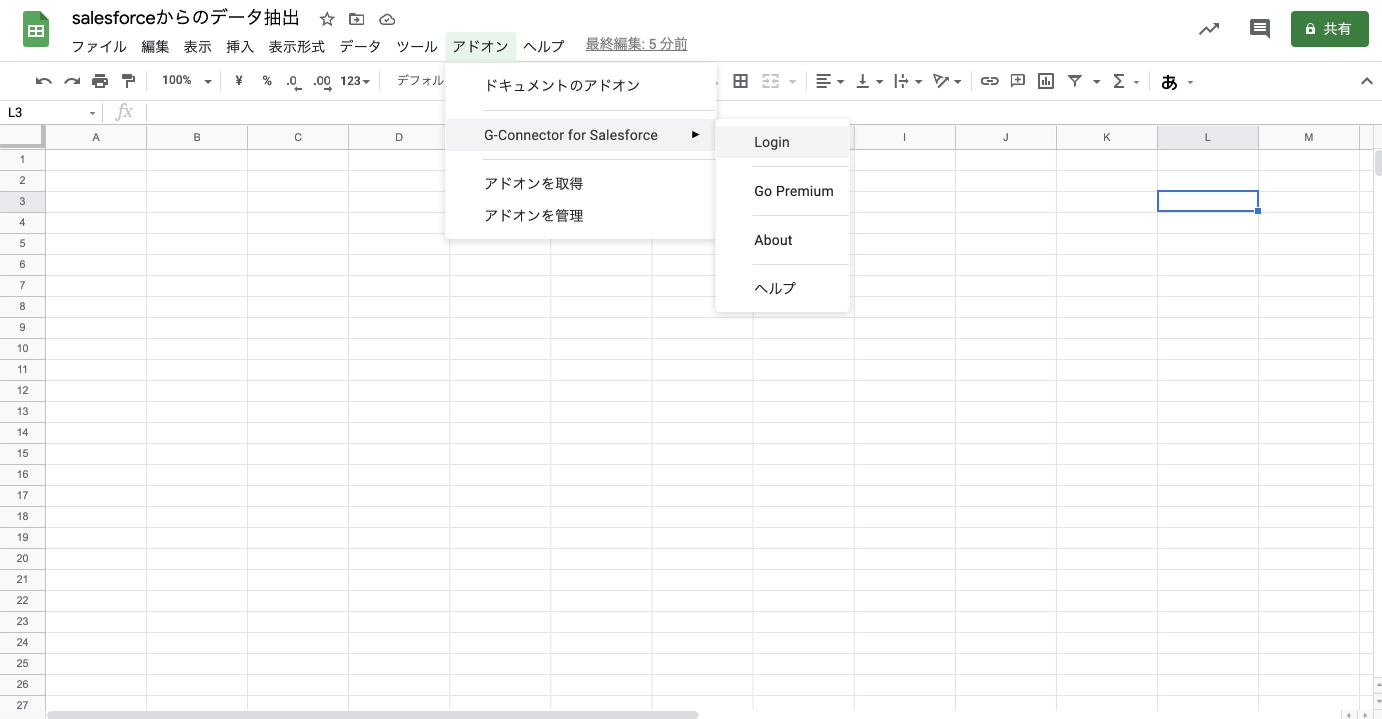 インストールが完了したら、一度スプレッドシートの画面をリフレッシュ(更新)し、再び、アドオンをクリックします。そうすると、「G-Connector for Salesforce」が現れるので、カーソルを合わせて、"Login"をクリックします。