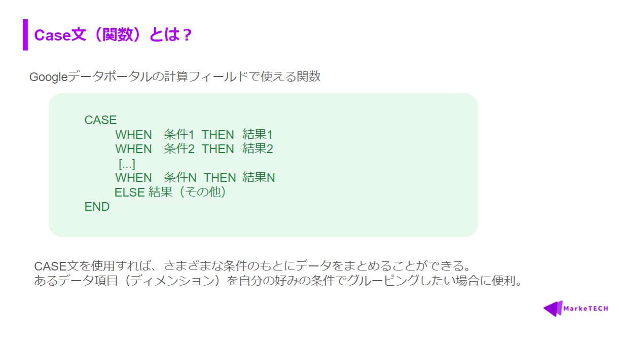CASE文を使用すれば、さまざまな条件のもとにデータをまとめることができます。特定のデータ項目(ディメンション)を自分の好みの条件でグルーピングしたい場合に便利な関数です。