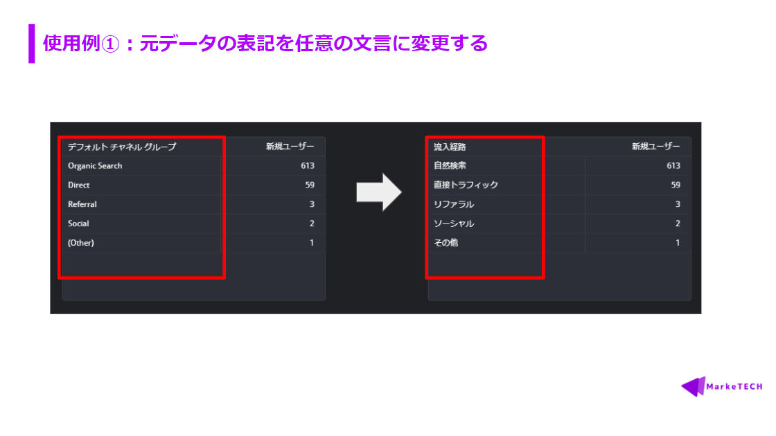 具体的には、下図の例①のような形です。例①では、Googleアナリティクスの項目”デフォルトチャネルグループ”を活用して、"Organic Search"→”自然検索”など、項目を日本語変換しています。