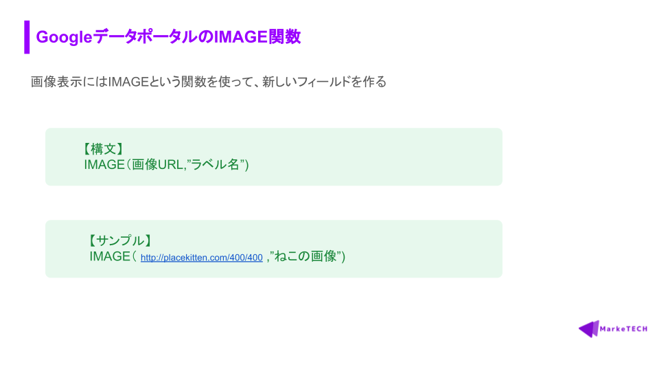 画像データを表示するには、IMAGE関数というものを利用します。これはGoogleデータポータルの計算フィールドで使うことができます。