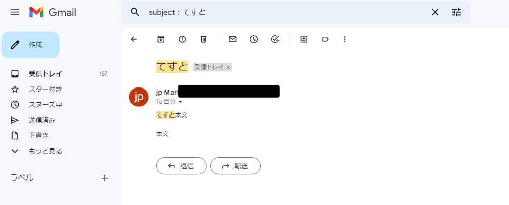 今回は、メールの件名が”てすと”というメールを検索したいので、