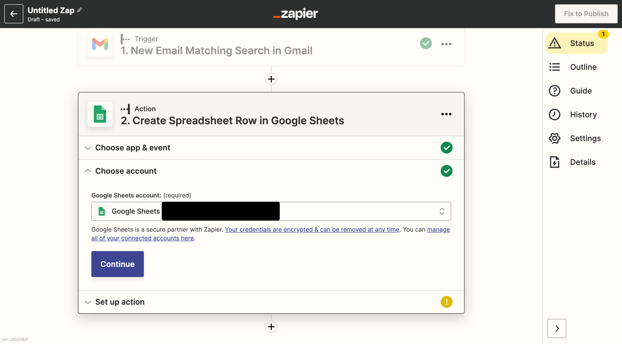 次に、Googleスプレッドシートの情報にZapierがアクセスするために、Googleアカウント認証を行います。
