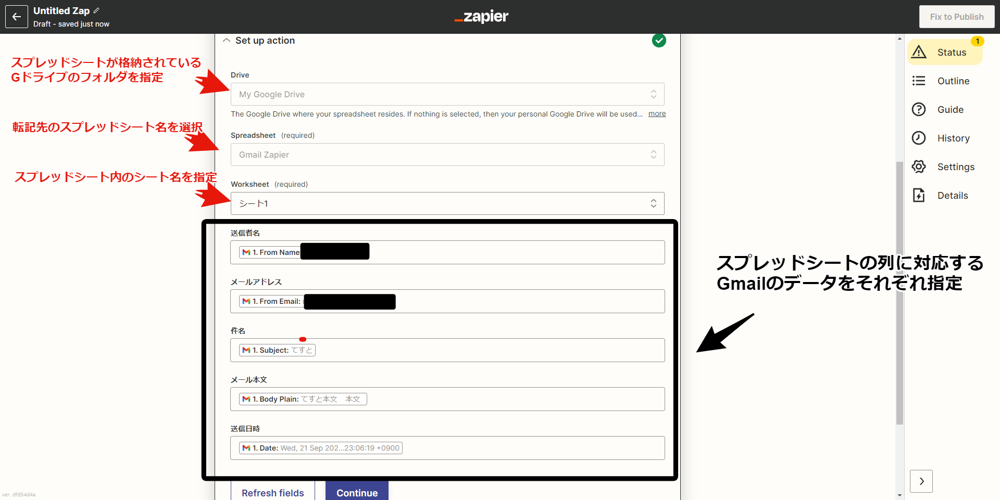 次に、スプレッドシートの列名に対応するGmailのデータを指定してあげます。これは、Triggerで取得したGmailのデータです。
