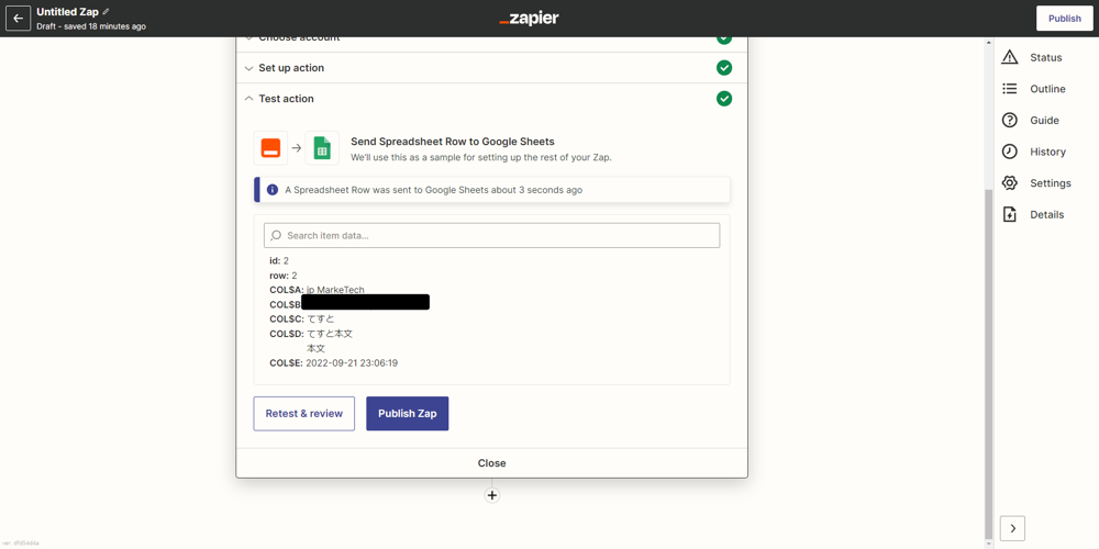 これで、今後、”てすと”というメールを受信するたびに、スプレッドシートにGmailの情報が転記されるようになります。