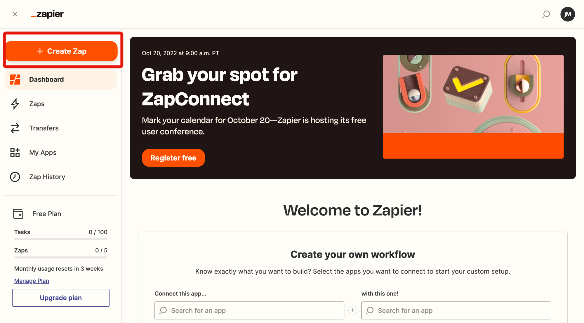 Zapierを開き、”Create Zap”をクリックし、設定をスタートします。