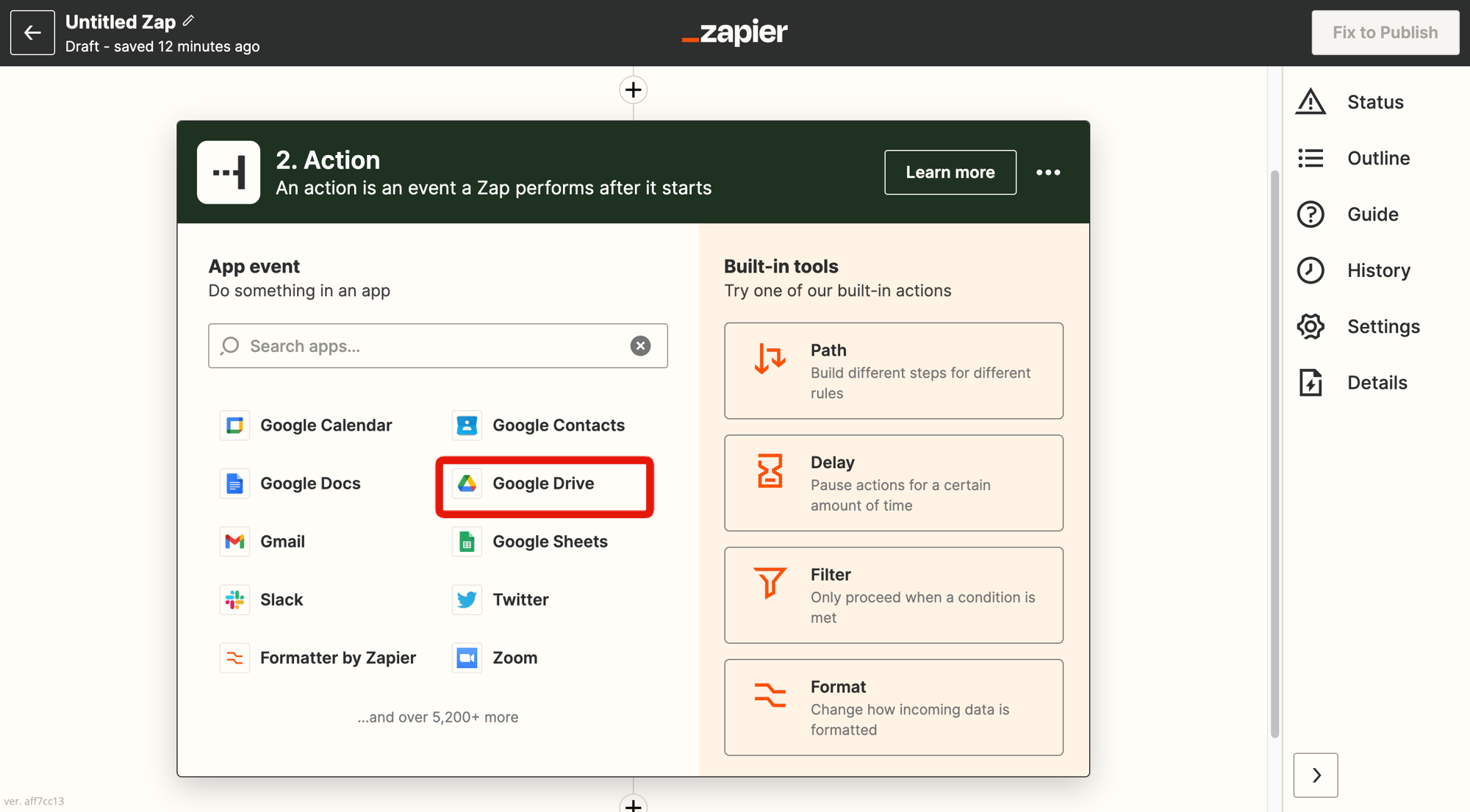 Googleドライブで行いたいアクション(イベント)を選択します。