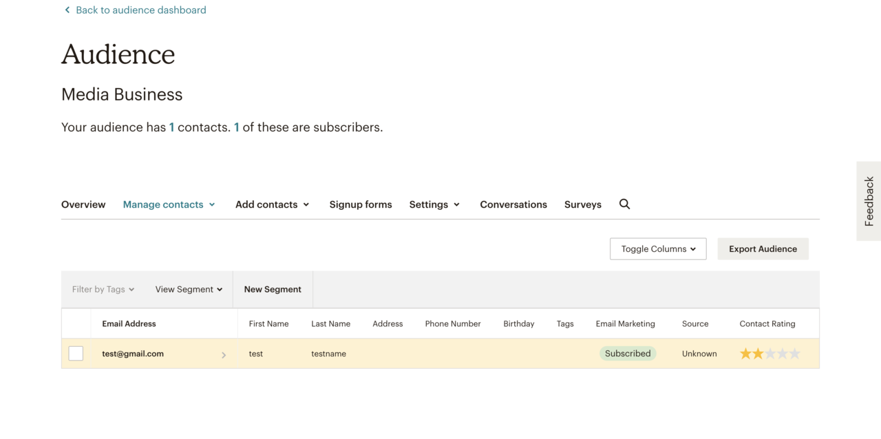 Mailchimpでは、顧客データを管理するデータベースをAudience(オーディエンス)と呼んでいます。Audienceに、メールアドレスや電話番号、名前といったフィールドを与えて、顧客情報(コンタクト)をテーブル形式で保持・管理します。Audienceに対して、メールを送るイメージです。