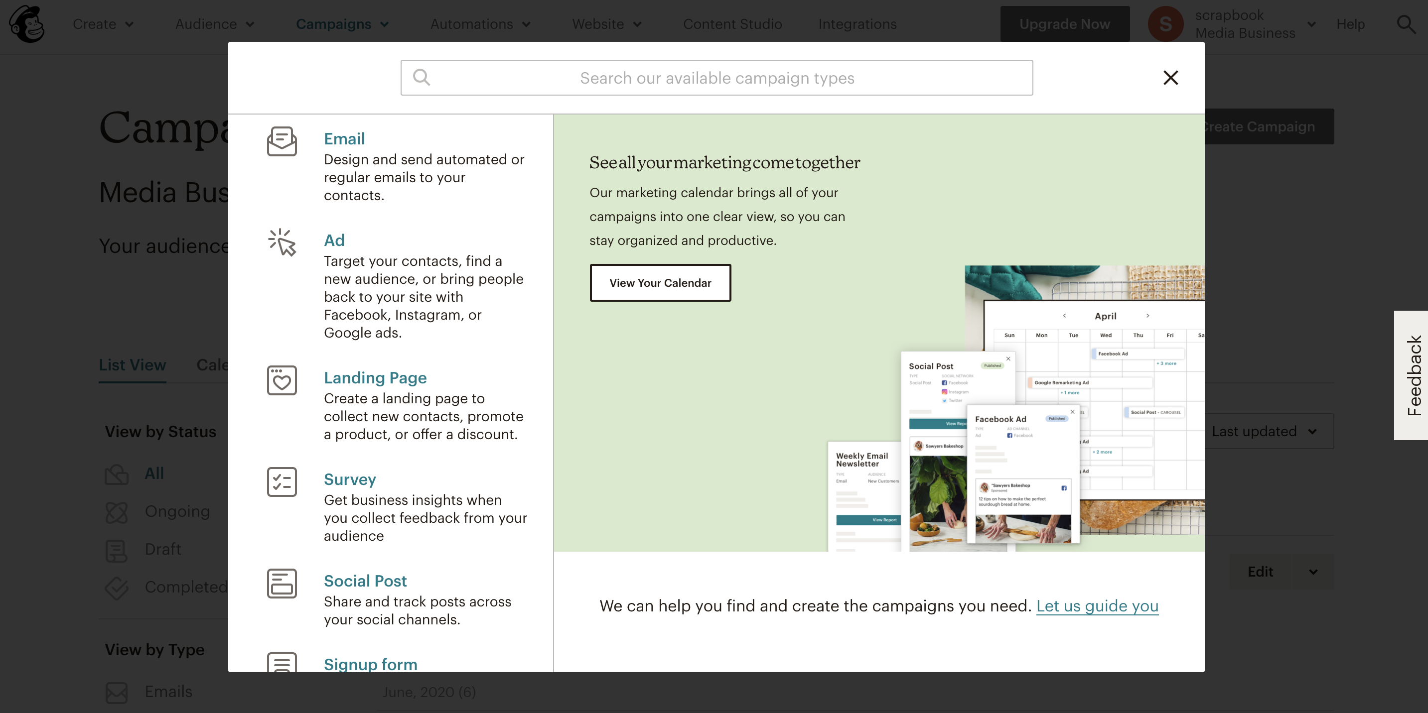 Standardプランまで契約しておけば、Eメールの他に、LP、メール自動化、フォーム、アンケート、レポート、広告、その他連携など、Mailchimpの強力な機能のほとんどが利用できます。