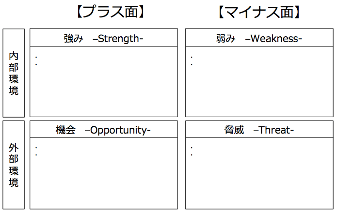 自社の置かれている環境の情報を整理・把握できたら、自社にとってのビジネスの機会を見定めて、自社が重点的に取り組むべき戦略目標を固めます。この時の整理方法としては、教科書的には、SWOT分析を用いることが多いです。