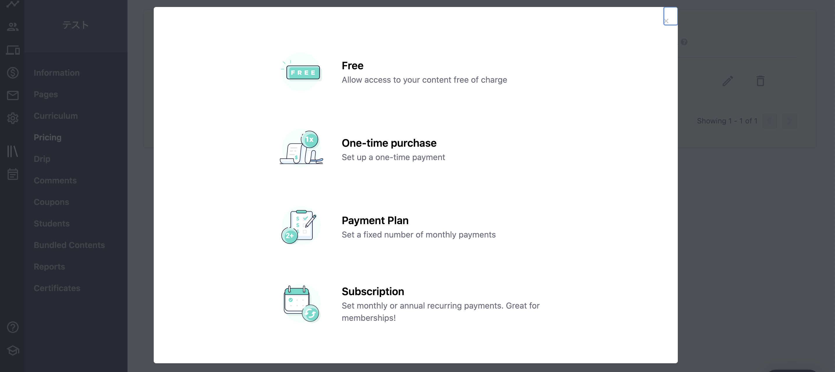 講座の料金も柔軟に設定できます。無料〜サブスクリプションまで。Stripeと連携すればクレジットカード決済に対応できるので、いちいち受講者から金額を徴収する必要はありません。