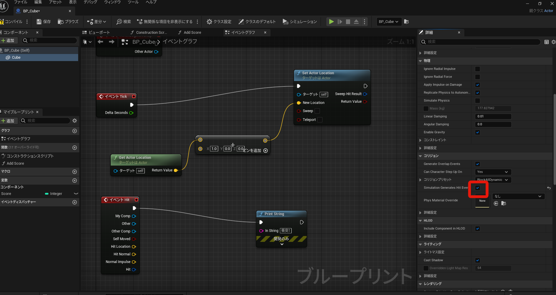 この時、Cubu(オブジェクト)のコリジョン設定で、Simulation Generates Hit Eventにチェックを忘れずにいれます。