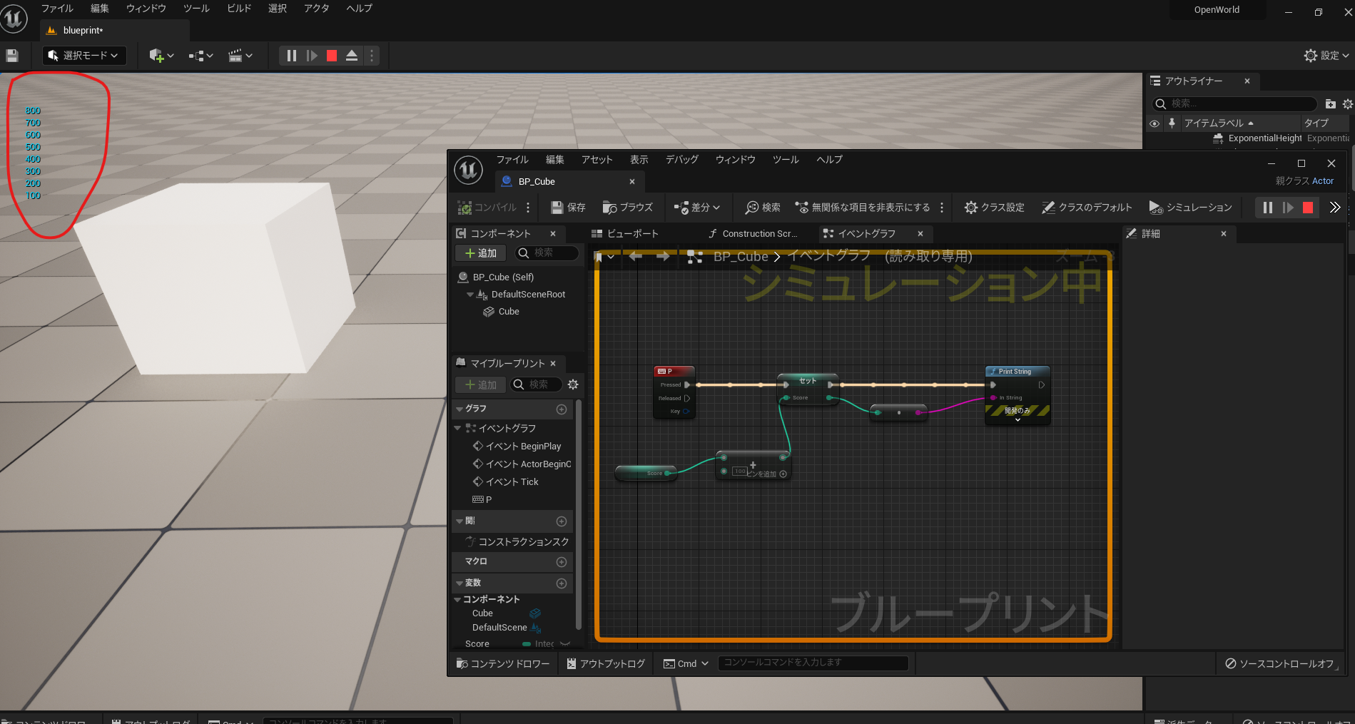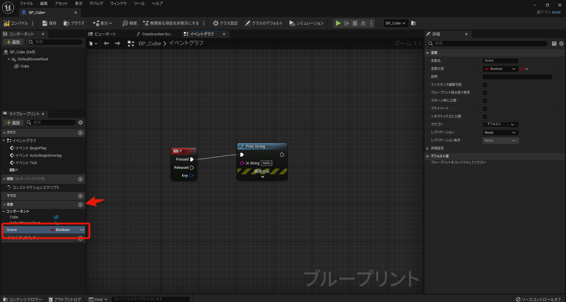 加算の処理をいれ、Pキー押下のタイミングで、set Scoreで変数の上書き。Print Stringで数字を表示する。これで完成。