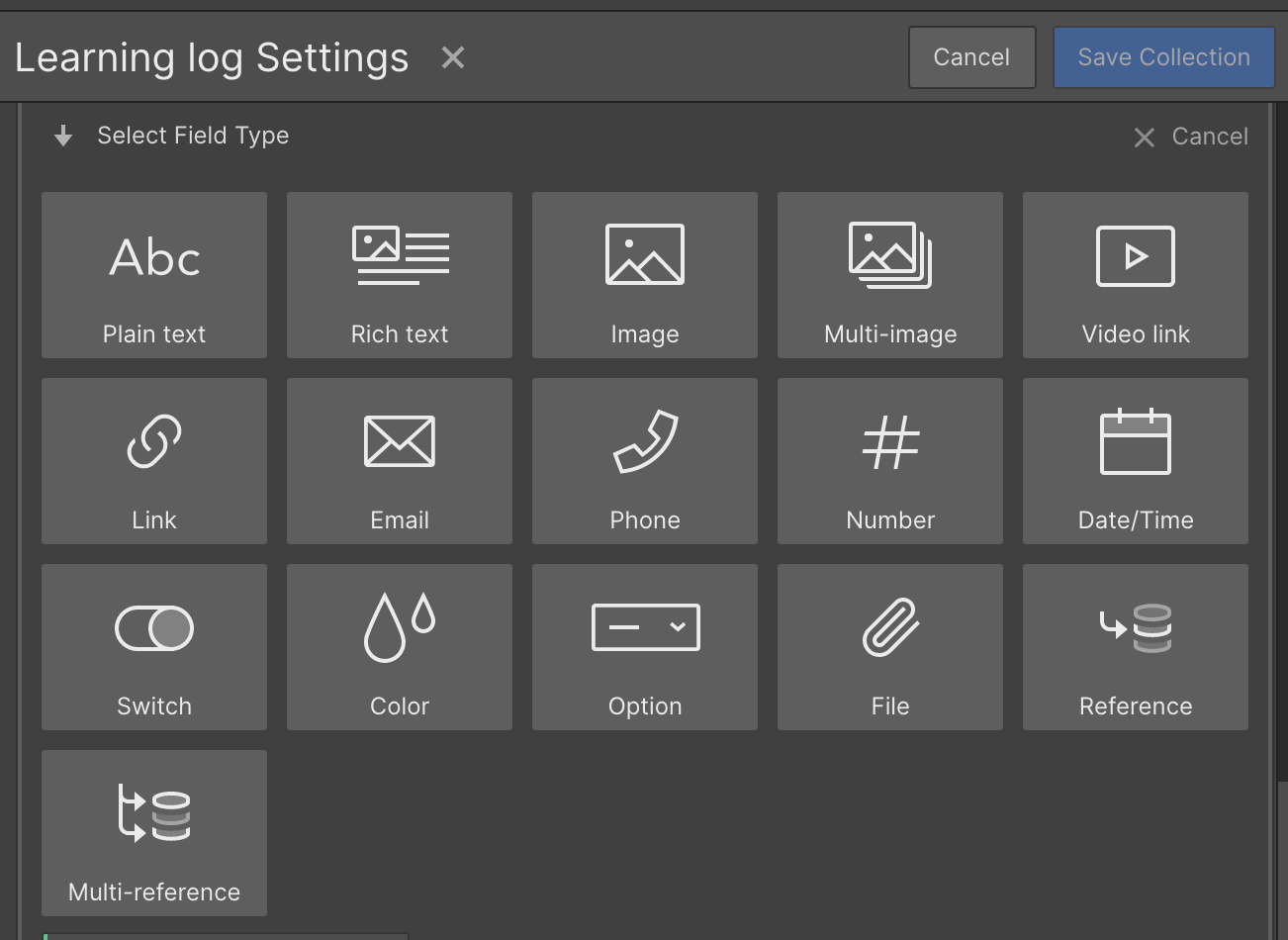 Collection fields(コレクションフィールド)がいわゆる、テーブルの構成要素。必要なデータ型のフィールドを選んでテーブルで保持したいデータ型を決定します。フィールドを追加は、"Add New Field"からおこなう。